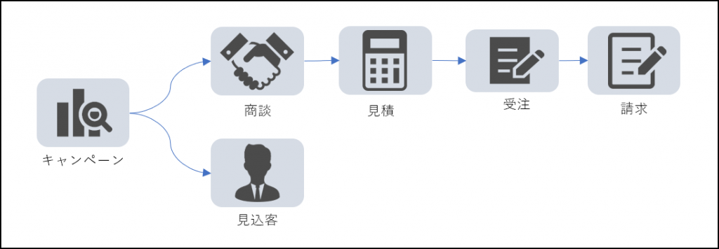 OpenCRMは顧客情報を中心に関連する様々なデータが数珠繋ぎのように繋がっています。
