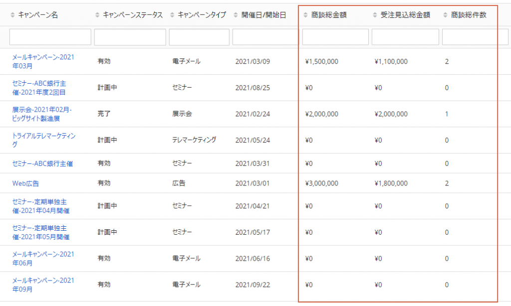 データは任意のタイミングで集計されキャンペーン単位にどれだけの商談が発生し見込金額が積み上がっているかを確認することができます。